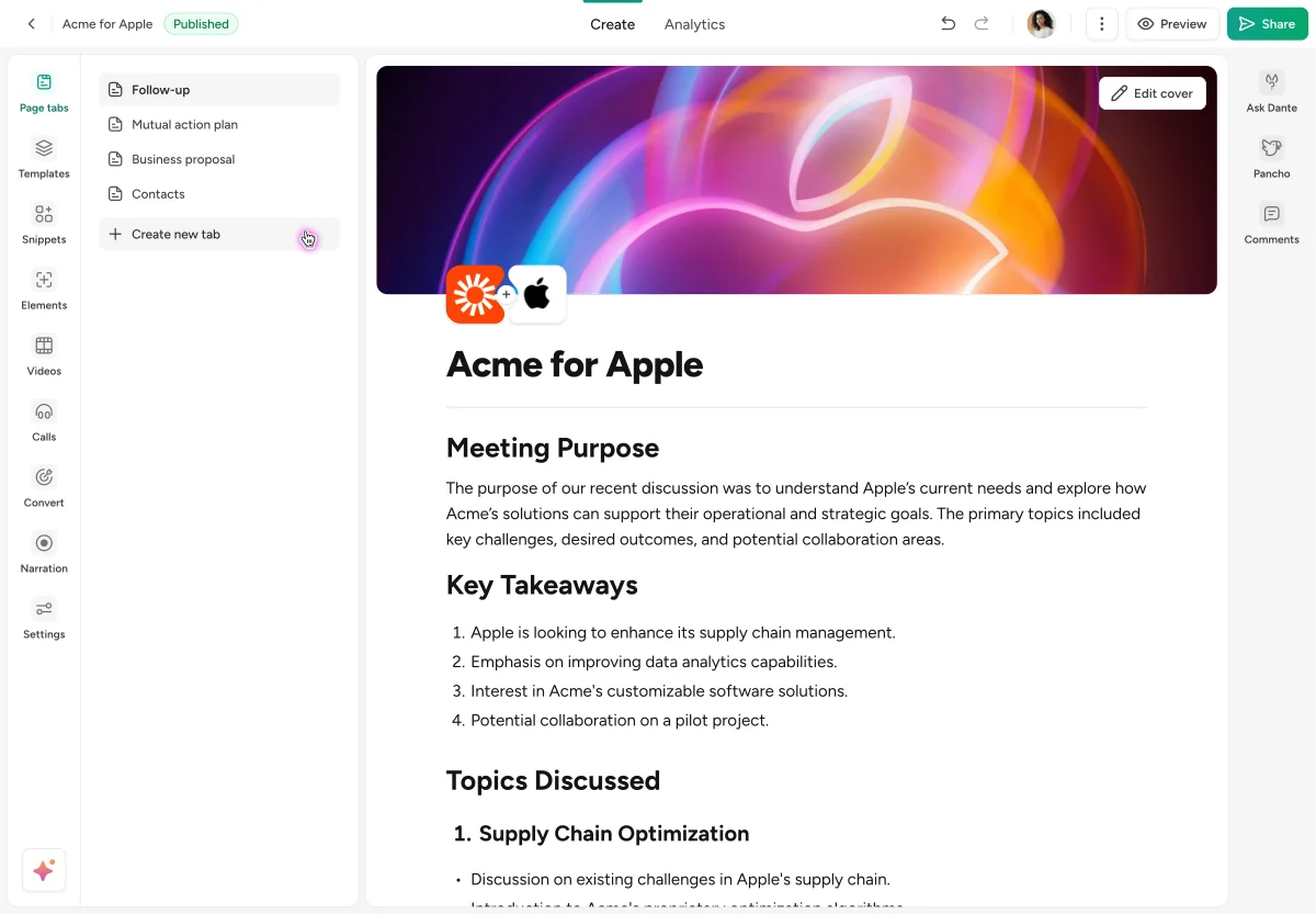 AI takes notes on your sales call or CS kickoff, then automatically builds a complete page in 60 seconds. One shareable link replaces your 55-slide deck and 27 email attachments. See who's viewing what, when decision-makers engage, and watch projects move from "we'll think about it" to "where do we sign?"